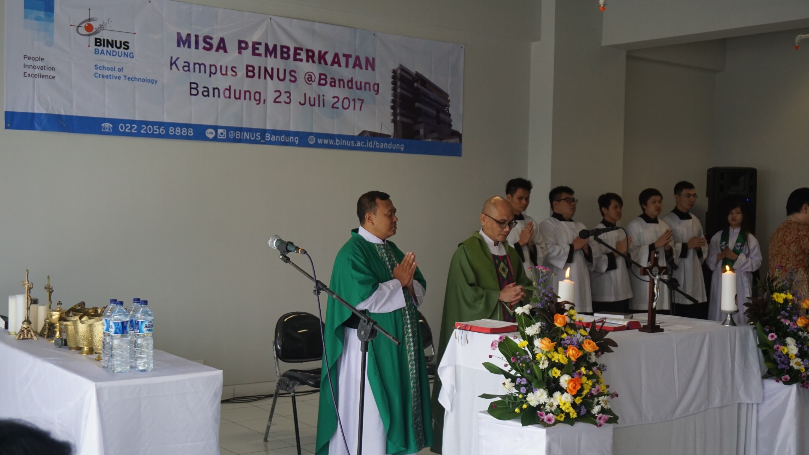 Pemberkatan tersebut dipimpin oleh Romo Onesius Oteneli Daeli dan Romo Agustinus Sugiharto yang didampingin oleh bapak Stephen Wahyudi Santoso selaku President of Higher Education, Bapak Andreas Chang selaku rektor BINUS @Bandung dan beberapa pimpinan lainnya. Para Romo ini akan bergerak mengelilingi kampus BINUS @Bandung. Memasuki semua ruangan kelas untuk mendoakan dan memerciki ruangan demi ruangan dengan menggunakan air suci.