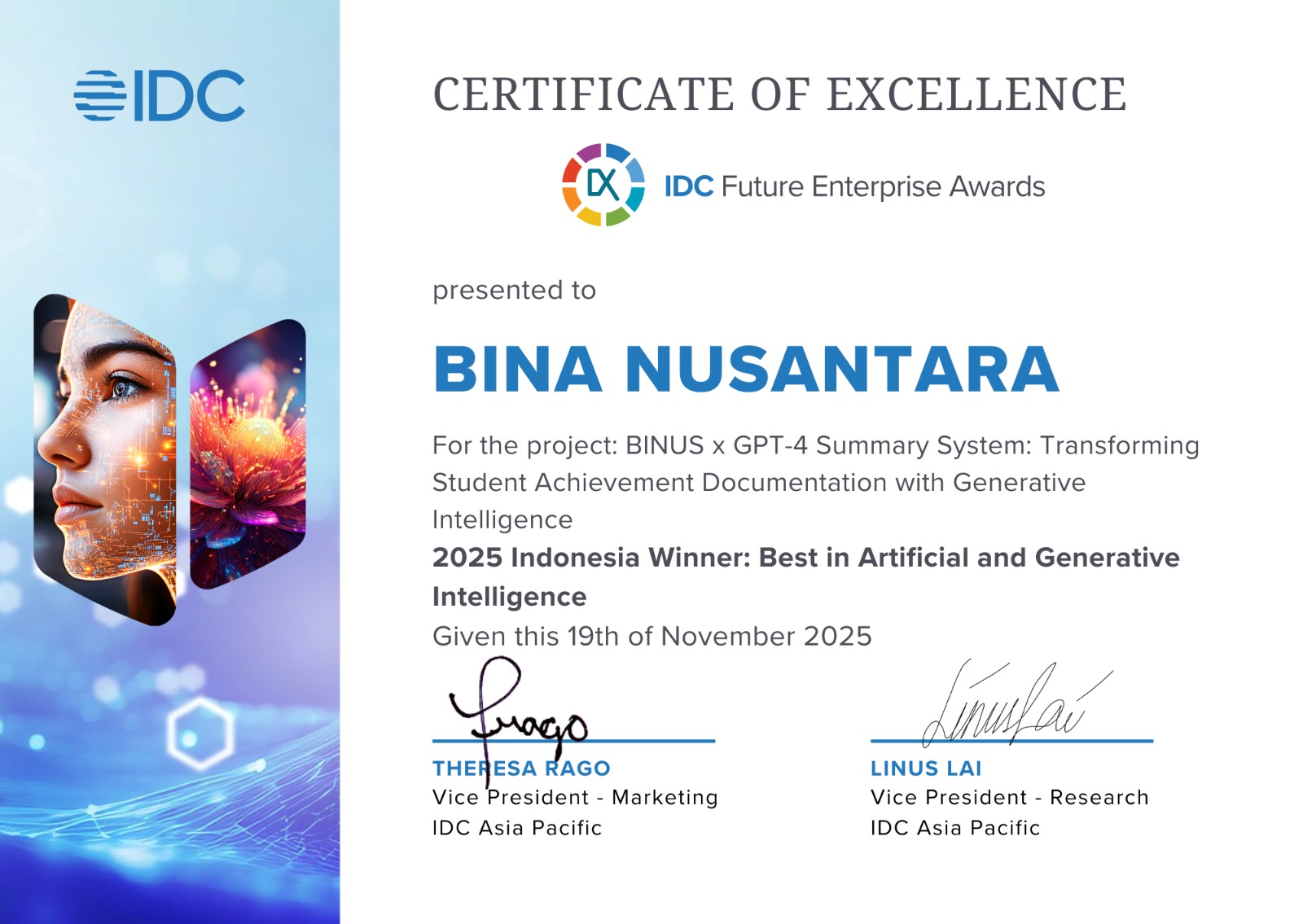 Salah satu institusi pendidikan yang berkomitmen pada hal tersebut adalah BINUS University, yang membuktikan komitmennya melalui raihan penghargaan “2025 Best in Artificial and Generative Intelligence” dari International Data Corporation (IDC) selama dua tahun berturut-turut. Penghargaan ini semakin mengukuhkan peran BINUS sebagai pelopor pendidikan digital di Indonesia, berkat integrasi teknologi AI dan Generative AI dalam kurikulum, metode pengajaran, serta ekosistem pembelajarannya. Langkah ini memastikan mahasiswa tidak hanya menguasai keterampilan teknis, tetapi juga memahami etika dan dampak sosial dari teknologi.