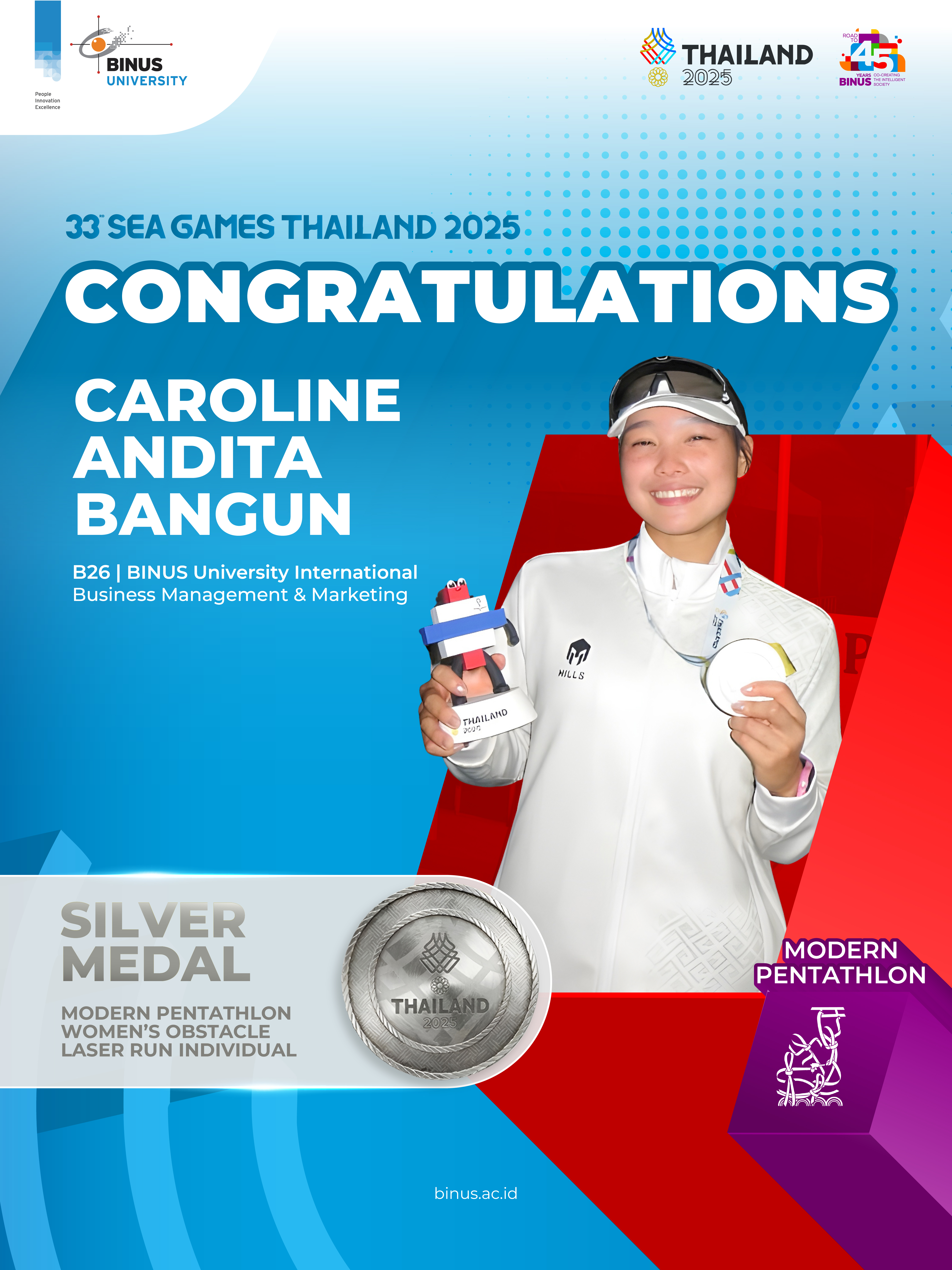 - Caroline Andita Bangun (B26, BINUS International-Business Management & Marketing) – Modern Pentathlon (Silver Medal)