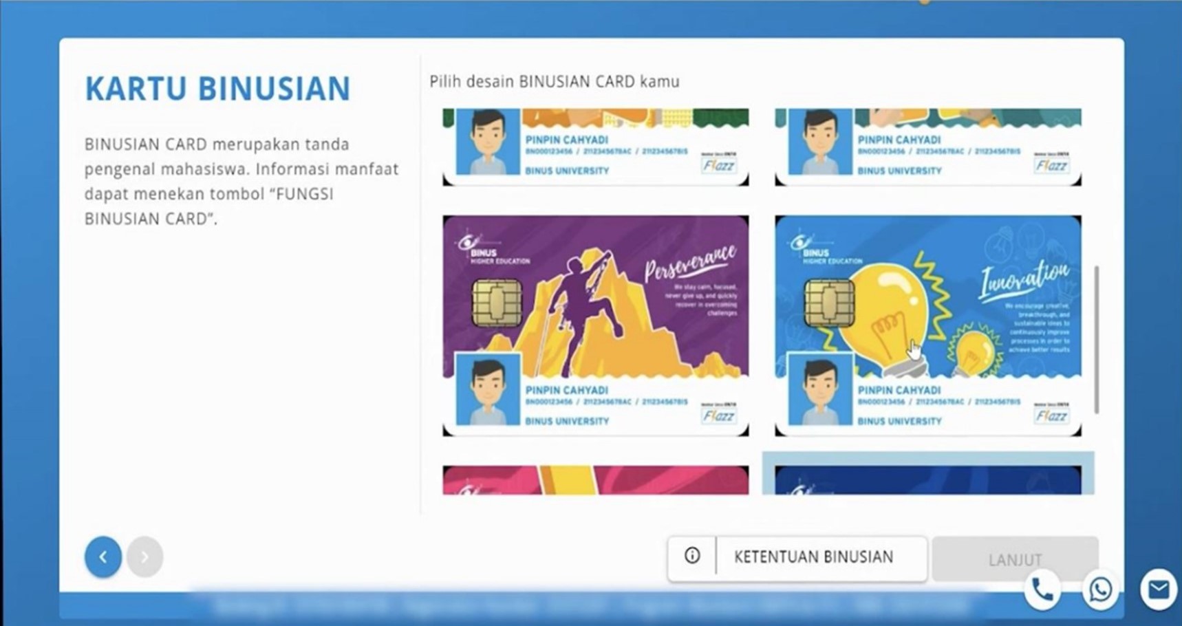 5. Pilih satu desain yang Anda inginkan dan klik Lanjut. Untuk informasi Ketentuan BINUSIAN silakan cek di kolom KETENTUAN BINUSIAN.