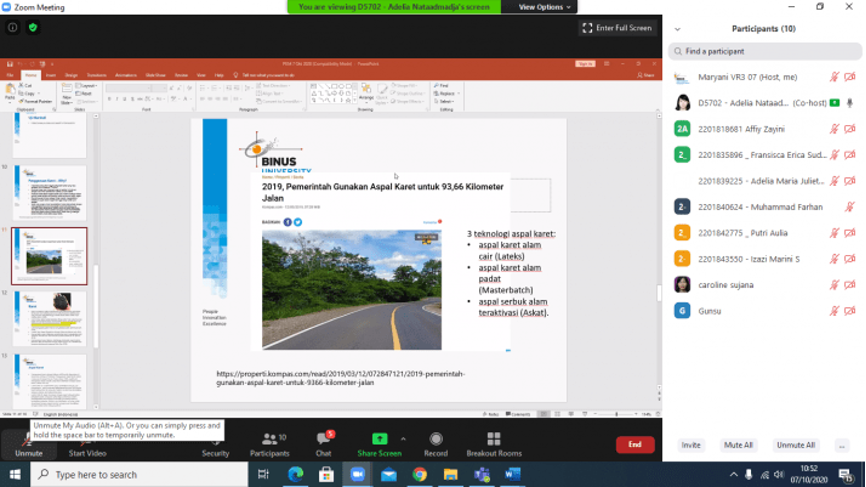 Bersama Andi Bayu Putra dan Dr. Caroline Maretha Sujana, Adelia Dwidarma Nataadmadja dalam acara pelatihan teknik sipil yang diadakan BINUS UNIVERSITY pada 7 Oktober 2020 menyampaikan, penggunaan aspal karet di jalan akan membuat penyebaran beban jalan lebih merata. Hal ini disebabkan oleh struktur jalan yang lebih kaku, tetapi tidak menjadi rapuh.