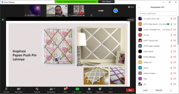 Berdasarkan fenomena ini, BINUS UNIVERSITY bersama dengan BINUSIAN mengadakan Pelatihan Membuat Handicrafts didukung oleh Interior Design Department BINUS. Pelatihan ini dilaksanakan pada 23 November 2020 dari pukul 10.20 sampai 14.30 WIB secara online melalui Zoom Meeting.